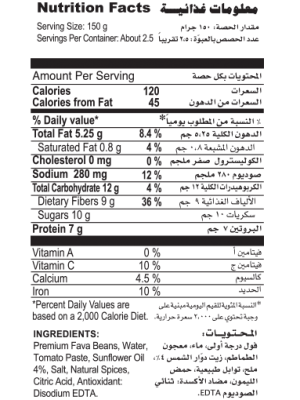 فول درجة أولى، ماء، صلصة الطماطم، زيت عبّاد الشمس، ملح، توابل طبيعية، حمض الليمون، ومضاد أكسدة: إي