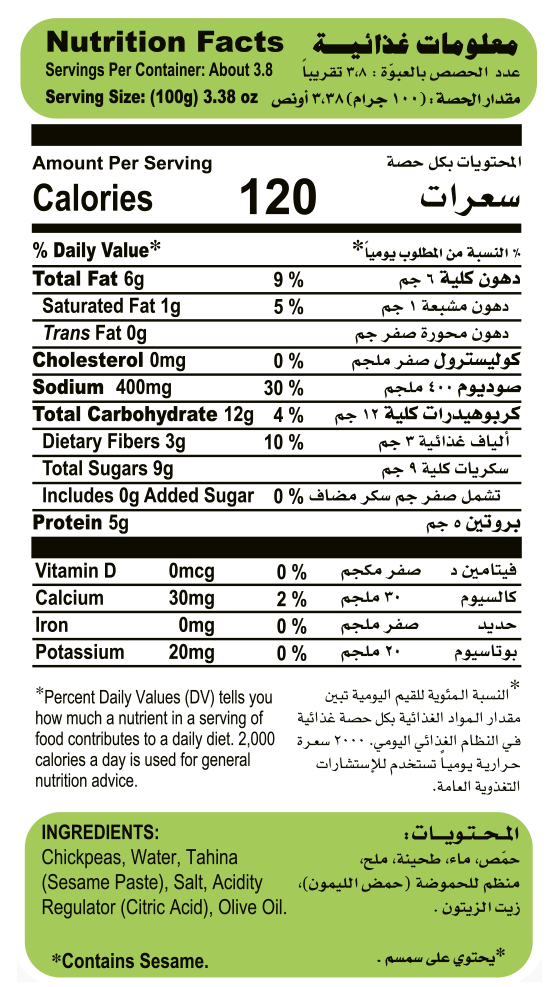 حمص، ماء، طحينة، ملح، منظم للحموضة (حمض الليمون)، زيت الزيتون.